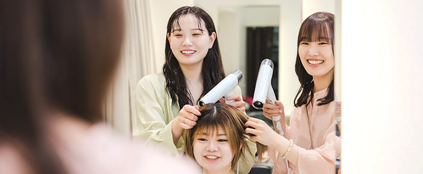 入社後は接客マナーから始まり、基礎的な知識と技術をしっかり習得しながら、スタイリストとしてのデビューを目指します。